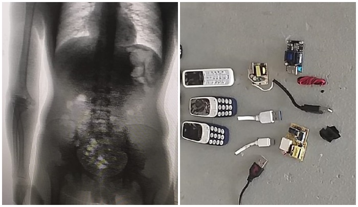 Ao todo, o homem expeliu oito mini aparelhos de celular com bateria, quatro plugs de cabo USB, sete chips de celulares e um fio de carregador de celular. Os objetos foram extraídos sem a necessidade de atendimento médico.