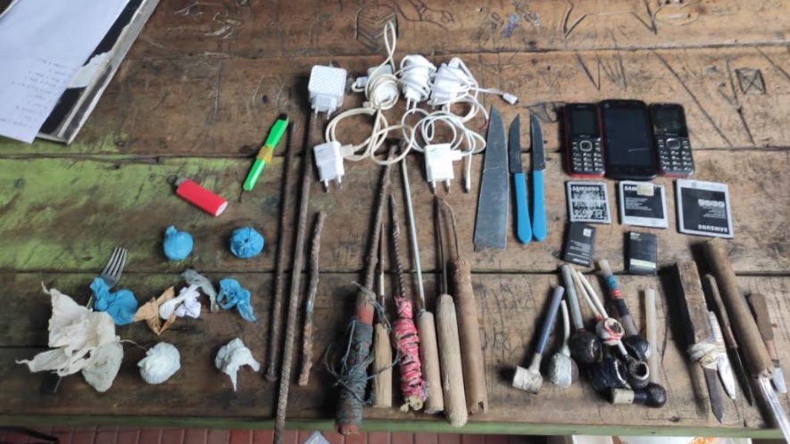 TEFÉ – AM | Prisão foi feita para o bandido pagar pelo que fez e quem sabe sair uma pessoa melhor. Só que não em Tefé, onde a polícia pegou nove cachimbos de fabricação artesanal para uso de drogas; seis carregadores de celular; três aparelhos celulares; três facas; cinco estoques (material perfurante); quatro barras de ferro de 30cm; cinco baterias de celular; 32,5 gramas de substância com aspecto de maconha do tipo skunk; um estilete e cinco simulacros de faca.