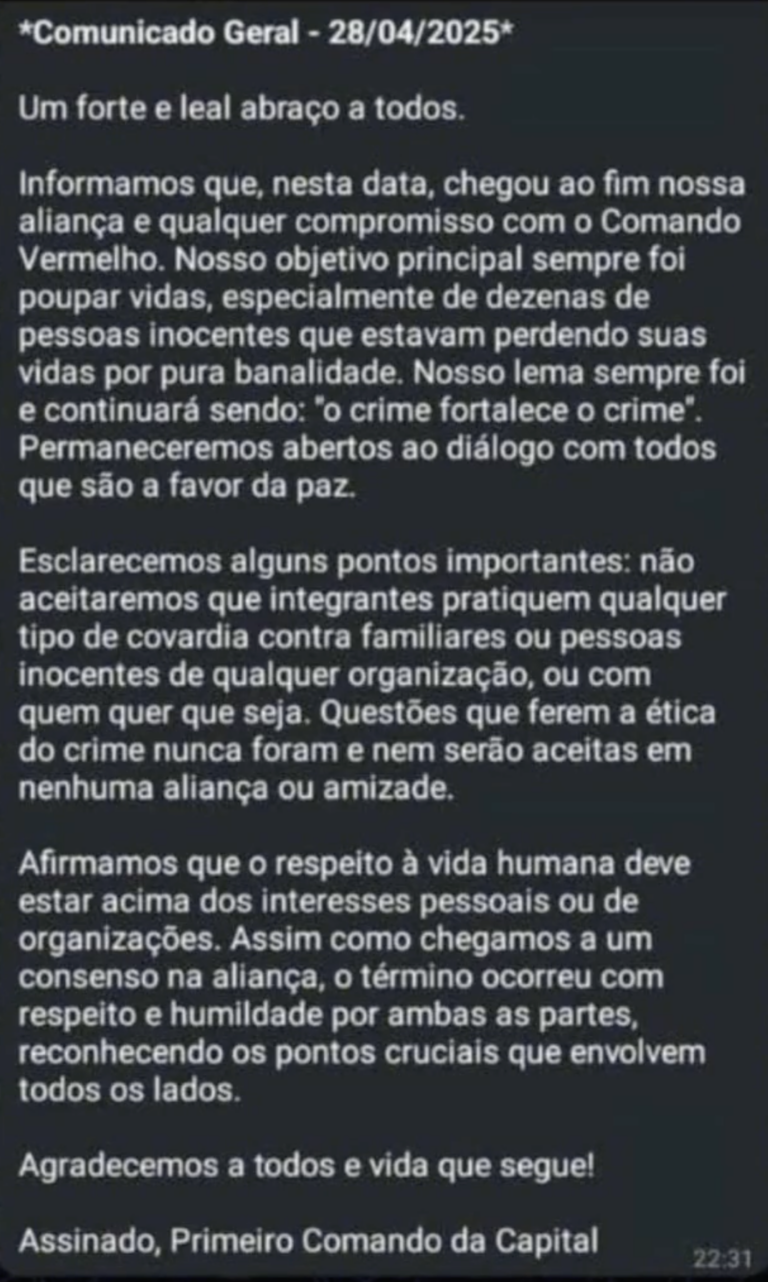 MANAUS – Acabou a paz entre o Primeiro Comando da Capital (PCC) e o Comando Vermelho (CV). O PCC emitiu um “salve” afirmando que as duas facções não são mais parceiras, como ocorria desde fevereiro deste ano. Agora é cada um para o seu lado.