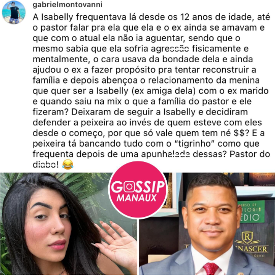 Segundo Gabriel, é que ela foi trocada pela atual do ex-namorado, tudo por dinheiro, o famoso “recurso” para a igreja. Numa postagem no Instagram, o rapaz disse que a influenciadora frequentava o local desde os 12 anos de idade e que mesmo o apóstolo sabendo da relação abusiva que ela vivia, a aconselhava a continuar a relação.