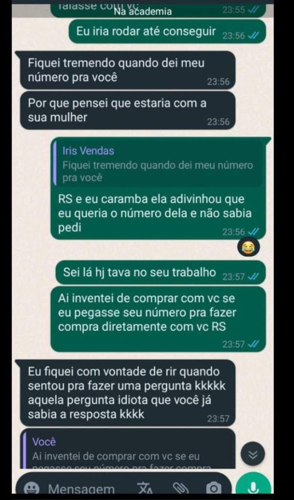 Nas mensagens, fica evidente que o homem ficou a fim da vendedora quando fazia uma compra no estabelecimento junto com a mulher. Mesmo assim, os dois ficaram se paquerando e a vendedora conseguiu dar o número do telefone depois.
