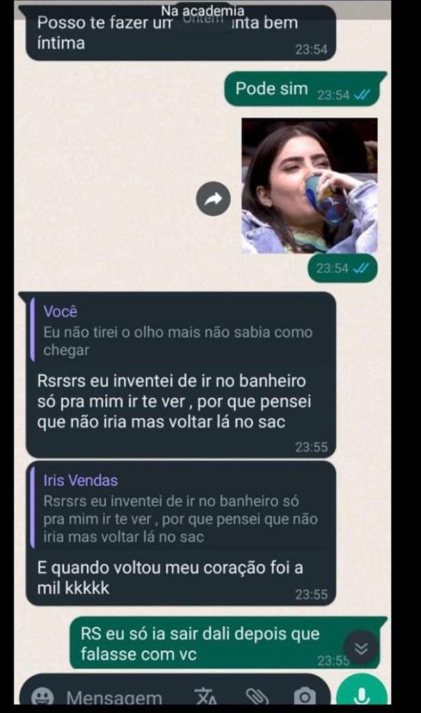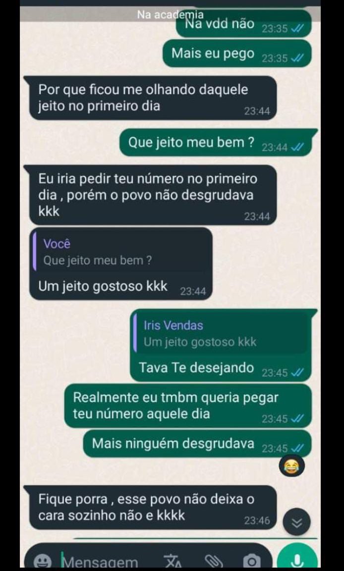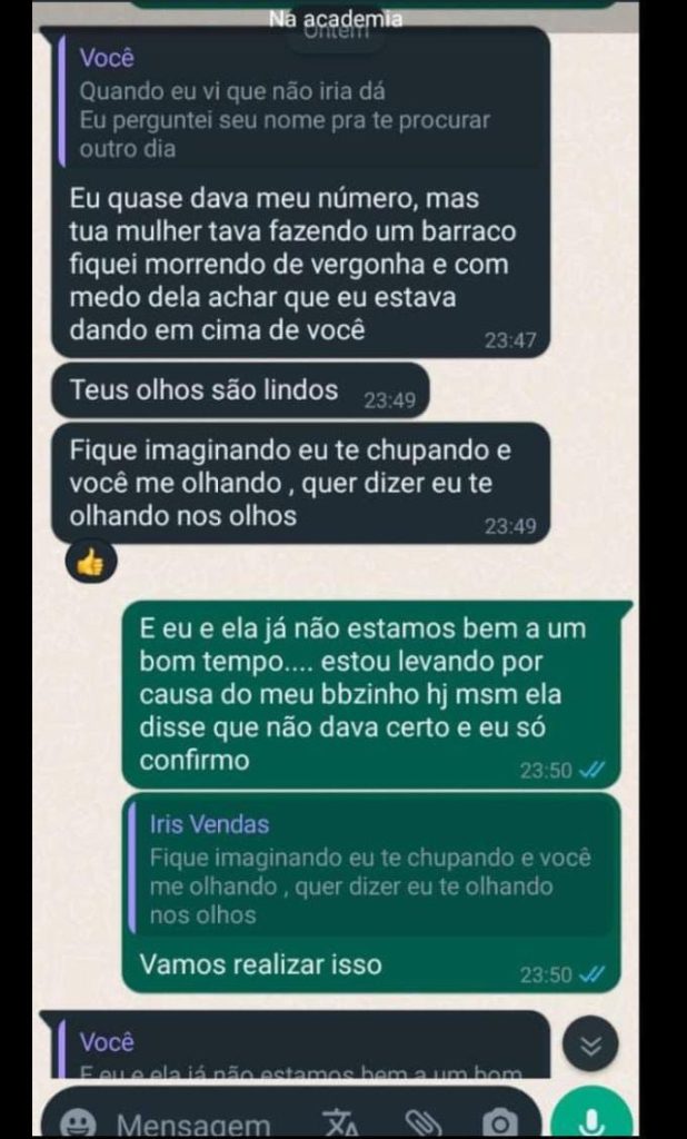 “Fiquei tremendo quando dei meu número pra você. Pensei que estaria com a sua mulher”, diz ela, identificada como “Iris Vendas”. O homem relata ainda que já não está bem com a esposa e que só continua com ela por causa do filho, que ainda é pequeno.