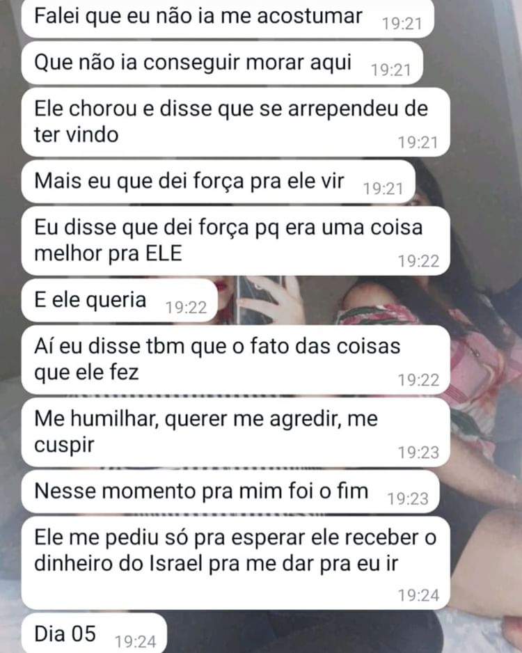 “Ele me pediu só pra esperar ele receber o dinheiro do Israel pra me dar pra eu ir. Dia 05”, diz uma das conversas que não indica o mês, mas mostra que Klicia queria ir embora o quanto antes. Ela diz ainda que já tinha falado ao agressor que ela não conseguiria se acostumar em São Paulo com ele e que o fim do relacionamento foi quando ele quis a humilhar, agredir e ainda cuspir.