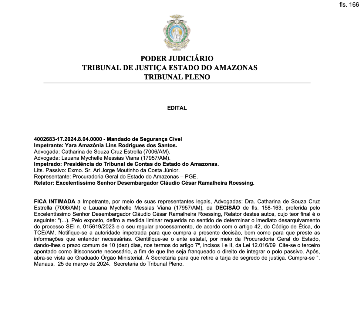 Manaus (AM) – O processo relacionado as ofensas proferidas no Tribunal de Contas do Amazonas (TCE-AM) pelo conselheiro Ari Moutinho Júnior a serem apurados em PAD (Processo Administrativo Disciplinar) por infração administrativa ocorrida em 03.10.2023 onde a vítima foi a Conselheira Yara Amazônia Lins, poucos minutos antes da eleição para a Presidência da Corte de Contas será desarquivado. Nesta quarta (27) o Tribunal de Justiça do Amazonas publicou no diário oficial, decisão do Desembargador Cláudio Roessing que concedeu liminar em mandado de segurança n. 4002683-17.2024.8.04.0000 para determinar o desarquivamento do processo administrativo em face do conselheiro para que respondesse por seu ato nos termos do Código de Ética.