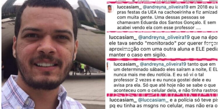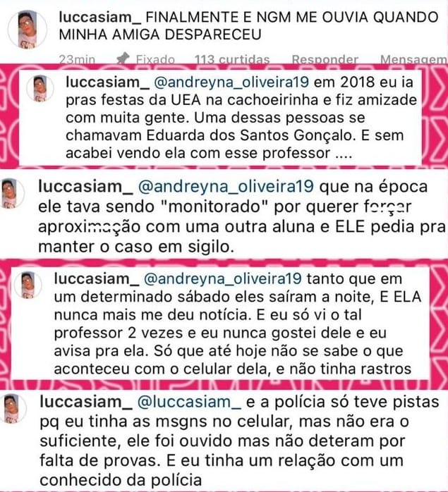 ‘Em 2018 eu ia para as festas da UEA, na Cachoeirinha, e fiz amizade com muita gente. Uma dessas pessoas era a Eduarda dos Santos Gonçalo. Um dia, vi ela conversando com esse professor, que na época já estava sendo ‘monitorado’ por forçar aproximação com uma outra aluna. Ele pedia para manter esse caso em sigilo. Num determinado sábado, eles (Eduarda e Helder) saíram e ela nunca mais me deu notícias. A polícia só teve pistas porque eu tinha algumas mensagens no celular, mas não era o suficiente. O professor foi ouvido, mas não foi detido por falta de provas’.