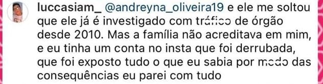 A testemunha conta que só conseguiu ser ouvido pela polícia porque tinha um conhecido dentro da polícia que o ajudou na denúncia. ‘Ele me contou que esse professor estava sendo investigado desde 2010 por tráfico de órgãos. Eu tinha uma conta no insta que foi derrubada simplesmente por não haver provas. Eu podia ser processado’.