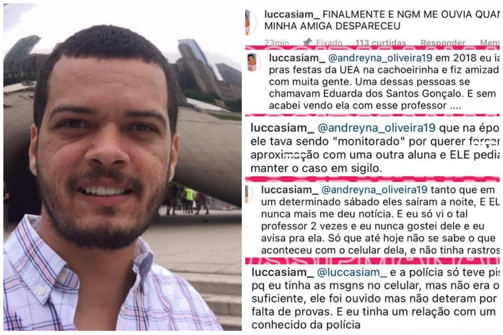 ‘Em 2018 eu ia para as festas da UEA, na Cachoeirinha, e fiz amizade com muita gente. Uma dessas pessoas era a Eduarda dos Santos Gonçalo. Um dia, vi ela conversando com esse professor, que na época já estava sendo ‘monitorado’ por forçar aproximação com uma outra aluna. Ele pedia para manter esse caso em sigilo. Num determinado sábado, eles (Eduarda e Helder) saíram e ela nunca mais me deu notícias. A polícia só teve pistas porque eu tinha algumas mensagens no celular, mas não era o suficiente. O professor foi ouvido, mas não foi detido por falta de provas’.
