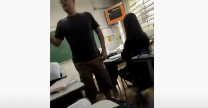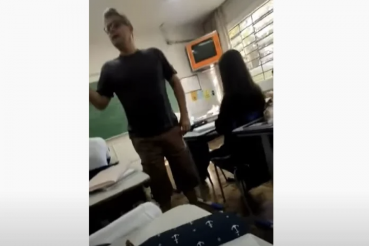 Nas imagens feitas por um estudante, o educador critica o que chamou de “concentração dos meios de comunicação”, xingou o chefe do Executivo e pôs em dúvida a sexualidade de Bolsonaro durante a aula.