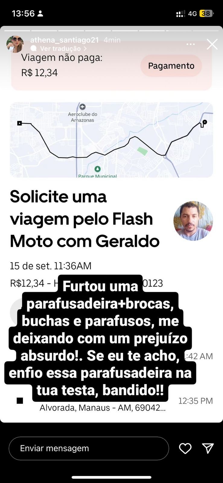 O homem identificado apenas como “Geraldo” aparece em foto segurando a sacola com a encomenda. Segundo a professora, o valor da viagem deu R$ 12,34. “Furtou uma parafusadeira mais brocas e parafusos deixando com um prejuízo absurdo! Se eu te acho, enfio essa parafusadeira na tua testa, bandido!!”, disse ela.