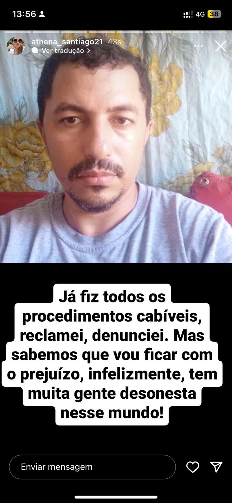 Athena disse ainda que o denunciou para a plataforma e que todos os procedimentos cabíveis já foram feitos. “Denunciei. Mas sabemos que vou ficar com o prejuízo, infelizmente tem muita gente desonesta nesse mundo”, lamentou.
