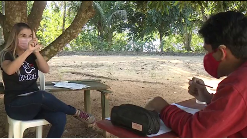 “Quando começou a pandemia, entrei em contato com a família, mandei mensagem porque aqui não pega celular, e perguntei se teria como eu fazer esse atendimento com todas as medidas de segurança: álcool em gel, máscara, distância, ao ar livre. A família me deu um sinal positivo, entrei em contato com a direção da escola e passei a situação sobre a forma como iríamos abraçá-lo para não ter evasão”.