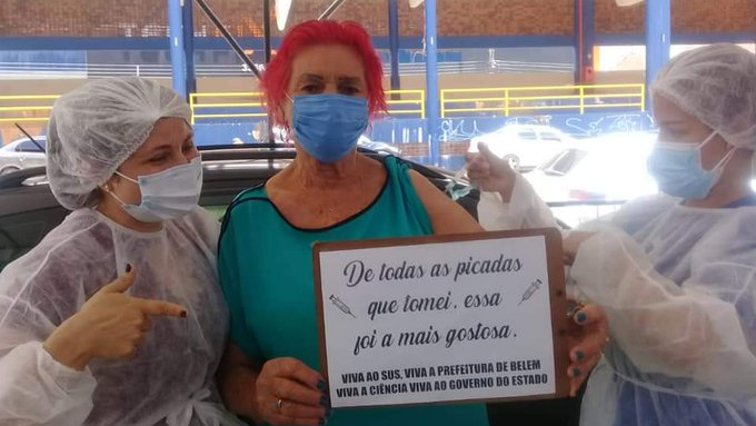 Lourdes, que é famosa em todo o estado por lutar pelos direitos das prostitutas, registrou o momento da vacinação, segurando uma placa que dizia: “De todas as picadas que levei, essa foi a mais gostosa”.