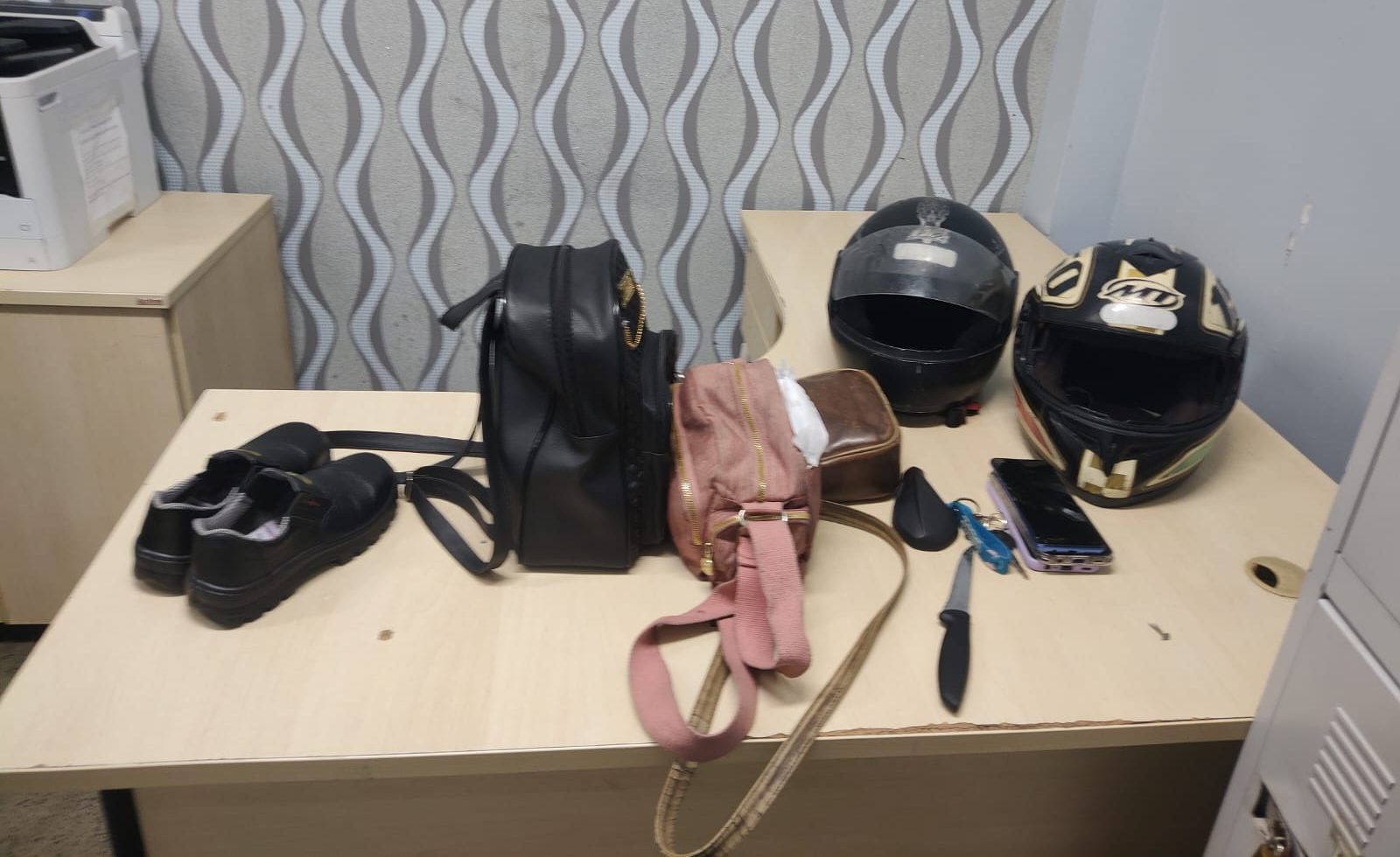 No local, a equipe policial visualizou os suspeitos. Um deles cortou a mão durante tentativa de fuga, sendo interceptado pelos PMs. Com os dois homens foram encontrados uma faca, três celulares, três bolsas, três peças de roupas, um par de botas e dois capacetes.
