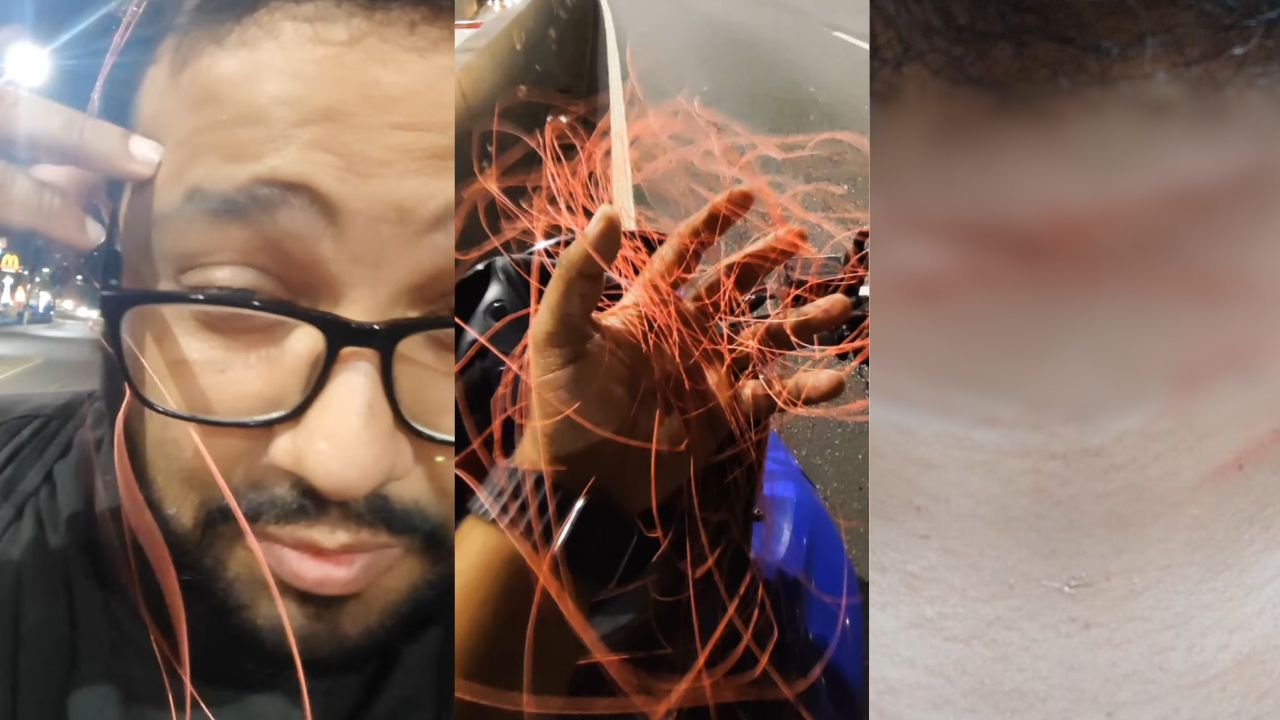 “Quase sou degolado por uma linha de cerol. Acabei de passar aqui no viaduto da Bola do Coroado, consegui tirar a tempo. Graças a Deus eu estava em baixa velocidade, mas em compensação, cortei meu dedo. Não é fácil, foi por muito pouco gente. Susto tremendo. Meu pescoço tá muito dolorido”, diz o profissional da comunicação no vídeo.