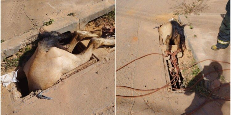 De acordo com os bombeiros, ao chegar no local do resgate no domingo (10), a corporação se deparou com um cavalo caído em um bueiro, com cerca de 1,5 metros de profundidade, ficando apenas com as patas traseiras para fora do fosso.