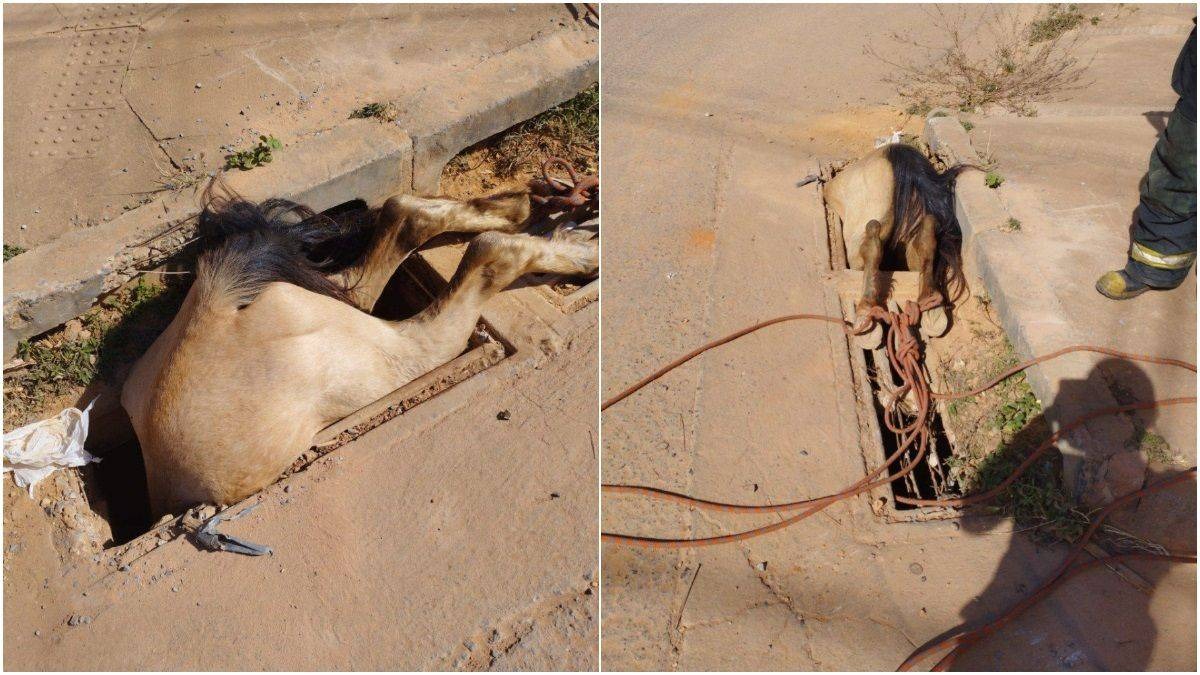 De acordo com os bombeiros, ao chegar no local do resgate no domingo (10), a corporação se deparou com um cavalo caído em um bueiro, com cerca de 1,5 metros de profundidade, ficando apenas com as patas traseiras para fora do fosso.