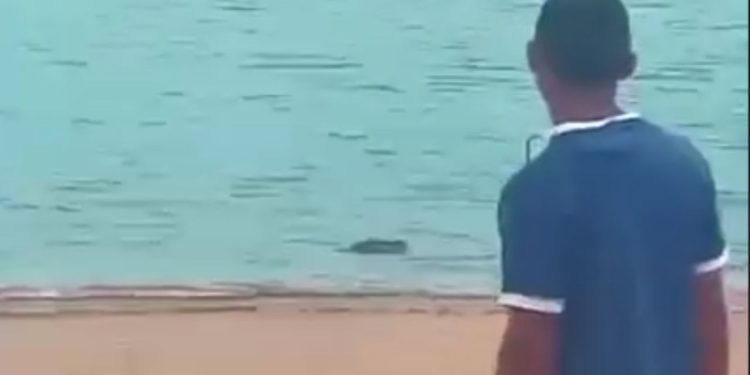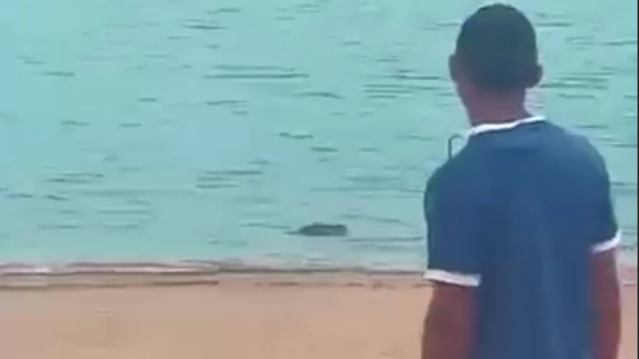 Em um vídeo compartilhado na internet mostra o réptil no rio enquanto banhistas jogam algumas coisas para espantá-lo.