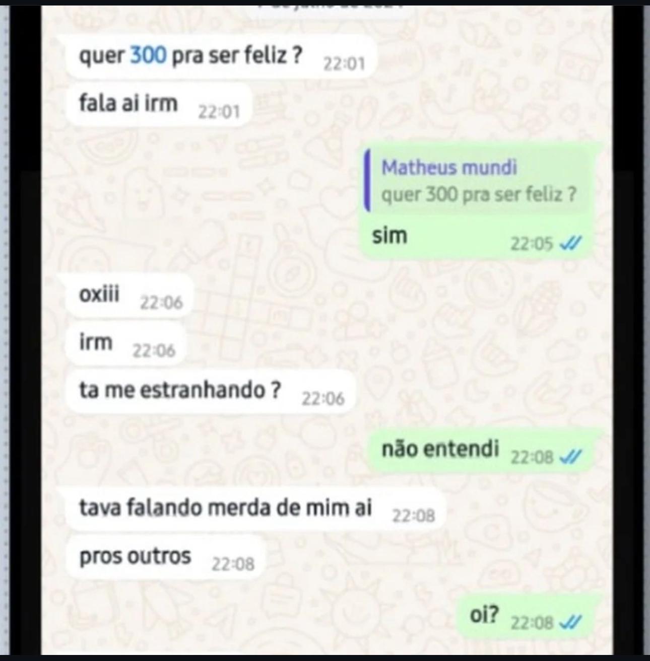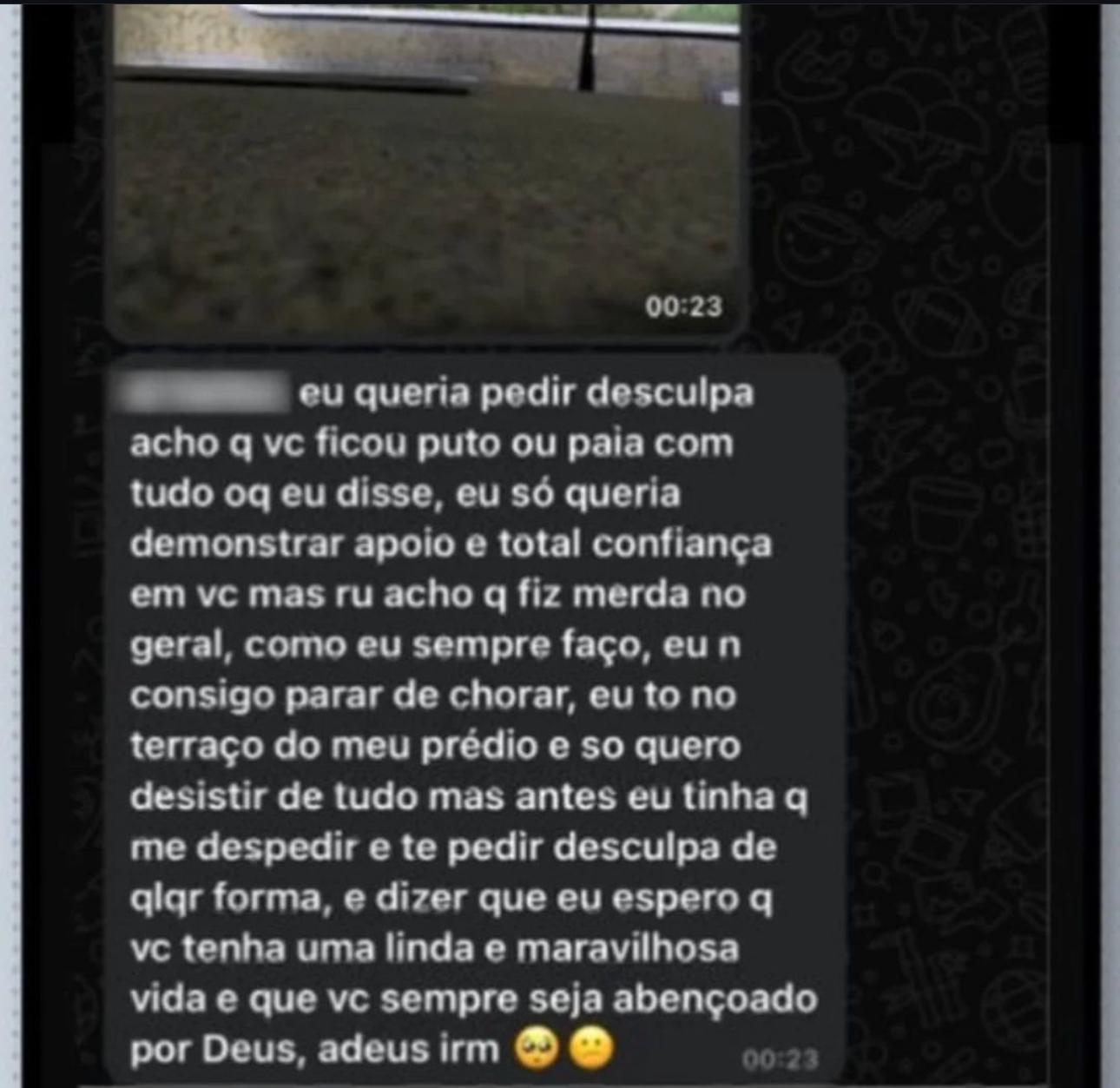 Em outro print, Matheus pergunta se a criança “quer 300 pra ser feliz?”. A vítima confirma, mas depois ele diz que a criança estava falando mal dele para os outros. No terceira conversa que a polícia teve acesso, o jovem diz que está no terraço do prédio e que vai desistir de tudo, mas queria pedir desculpas para o garoto.