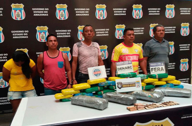 Manaus – Tatiane Gomes de Souza, 28, Roberto de Souza Ramos, 42, e mais três homens foram presos por suspeita de envolvimento com o tráfico de droga. Segundo o coordenador do Departamento de Investigações sobre Narcóticos (Denarc), Paulo Mavignier, com o grupo foi apreendido 40 quilos de entorpecente, entre pasta-base de cocaína e maconha do tipo skunk; e mais R$ 12 mil. Parte da droga estava escondida em uma embarcação ancorada em Manacapuru.