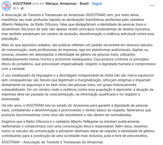 Em publicação nas redes sociais, foi pedido ainda que a Rádio Difusora e Pellegrine se retratem publicamente como forma de garantir o compromisso com uma comunicação responsável, respeitando a identidade de gênero dos indivíduos e combatendo o preconceito.