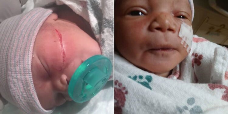 EUA | Um bebê recém-nascido nos Estados Unidos precisou de 13 pontos no rosto depois que uma cesariana de emergência a deixou com um enorme corte na bochecha.