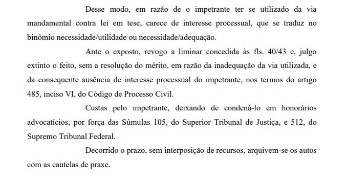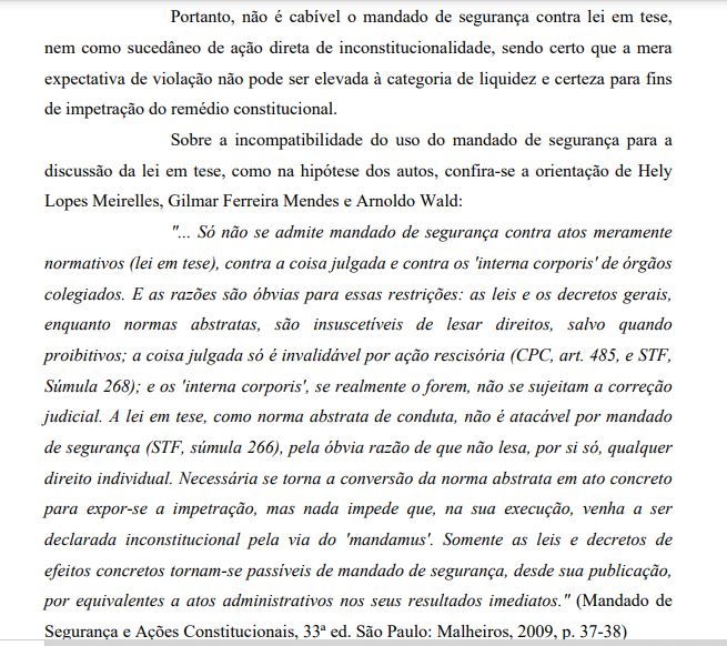 Em determinado trecho do documento divulgado, a relatora declara que “não é cabível o mandado de segurança contra a lei em tese, nem como sucedâneo de ação direta de inconstitucionalidade, sendo certo que a mera expectativa de violação não pode ser elevada à categoria de liquidez e certeza para fins de impetração do remédio constitucional”.