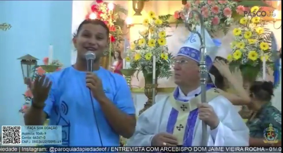 No vídeo, o jovem e o arcebispo estão lado a lado, em silêncio, na Igreja, esperando o início das câmeras. Quando o repórter começa a falar, entusiasmado, o clérigo se mostra assustado, mas Ricardo estava olhando para a câmera e não percebeu a reação. Ele inicia a entrevista desejando votos da Virgem da Piedade, já que uma novena para celebrar a festa de Nossa Senhora da Piedade, padroeira da cidade.