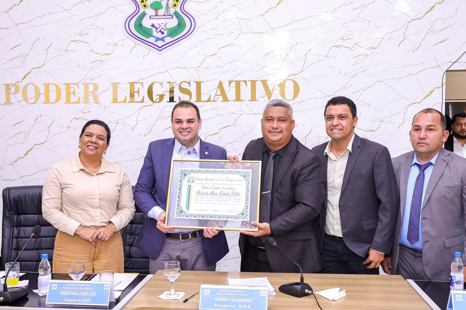 MANAUS (AM) – O presidente da Assembleia Legislativa do Amazonas (Aleam), deputado estadual Roberto Cidade (UB), é, oficialmente, cidadão de Nova Olinda do Norte. A maior honraria concedida pela Câmara Municipal foi entregue nesta quinta-feira (14), em reconhecimento ao trabalho e ações que o parlamentar direcionou ao município, conhecido como a “Princesinha do Madeira”. A proposta foi assinada e aprovada por unanimidade por todos os vereadores da legislatura passada.