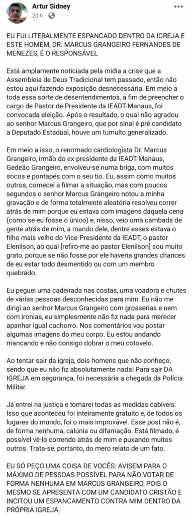 “O renomado cardiologista Dr. Marcus Grangeiro, irmão do ex-presidente da IEADT-Manaus, Gedeão Grangeiro, envolveu-se numa briga, com muitos socos e pontapés com o seu tio. Eu, assim como muitos outros, comecei a filmar a situação, mas com poucos segundos o senhor Marcus Grangeiro notou a minha gravação e de forma totalmente aleatória resolveu correr atrás de mim porque eu estava com as imagens daquela cena”, escreveu Artur, nas redes sociais.