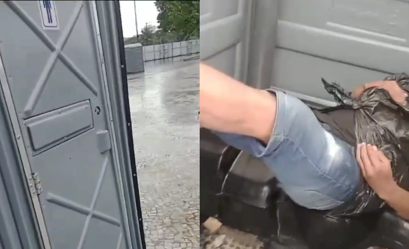 Nas imagens, a pessoa parece que exagerou na bebida alcoólica e é encontrado dormindo todo torto, de uma forma desconfortável. Ele é acordado por trabalhadores que iam retirar os banheiros do local.