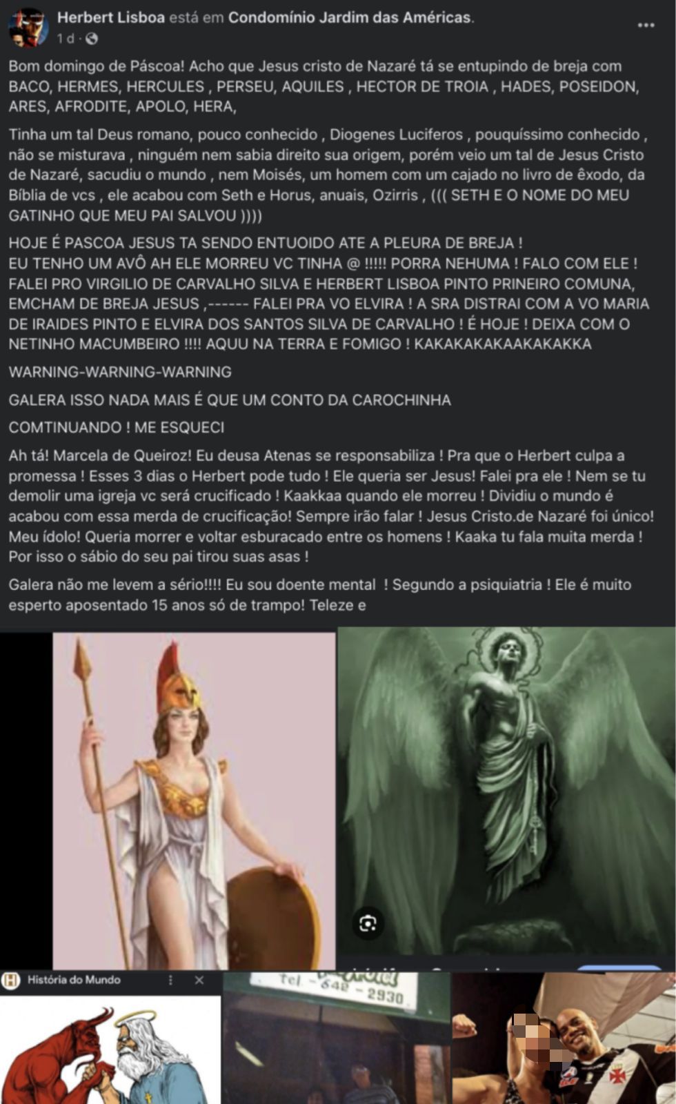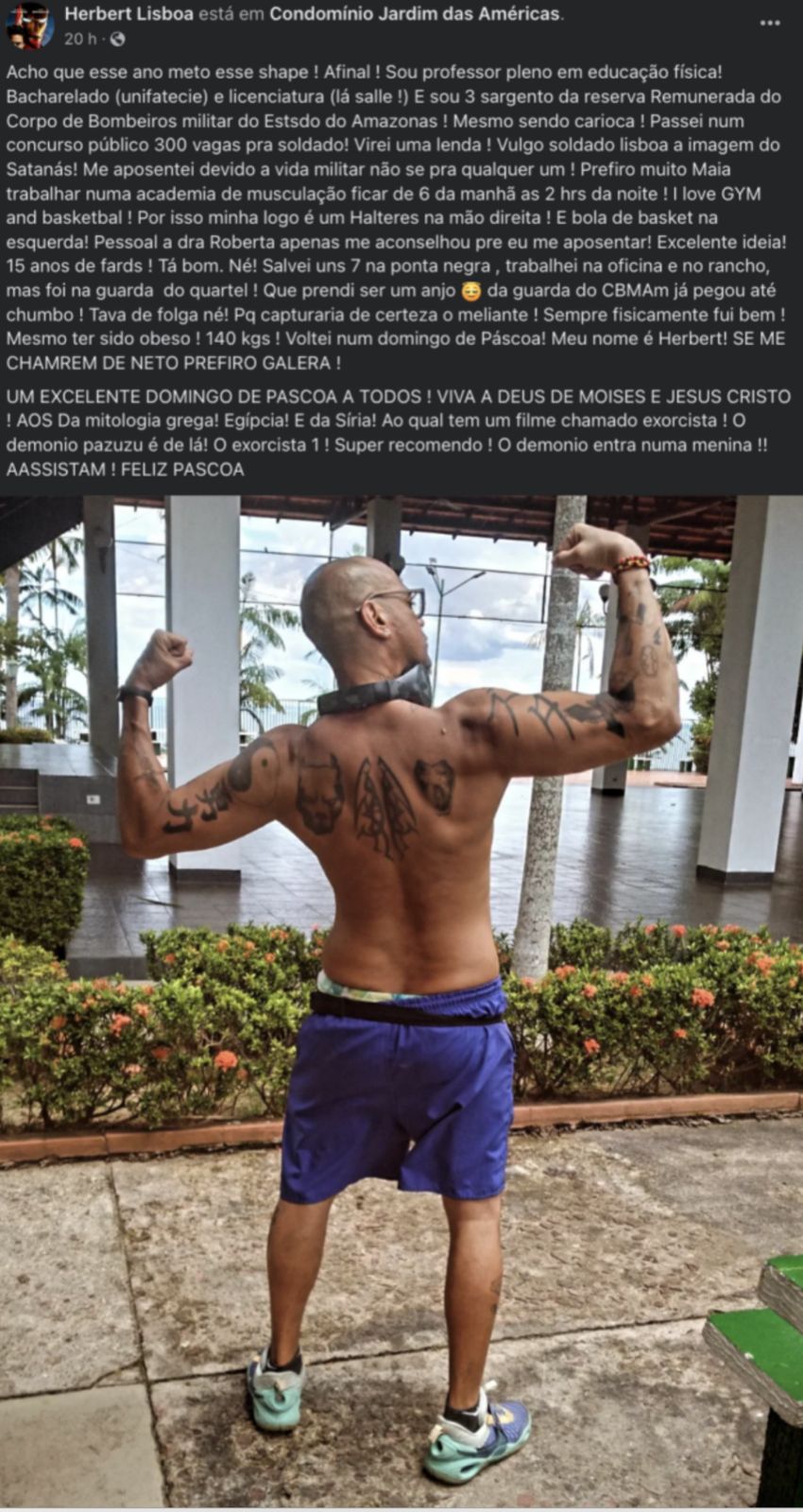 Sua presença nas redes sociais revela indícios de distúrbios, com publicações que abordam temas como religião, política e referências a filmes de Hollywood e super-heróis, como Legião, John Constantine e Homem de Ferro. De maneira peculiar, ele parece estar ciente disso e chega a fazer piadas sobre sua condição.