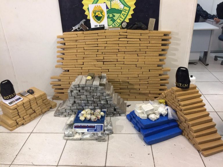 Foram apreendidos mais de 200 quilos de maconha, mais de 4 quilos de haxixe, 3 quilos de cocaína e 1 quilo de crack, além de um revólver calibre 38 e uma pistola 9mm com carregador alongado e munição de mesmo calibre. O suspeito deve responder pelos crimes de tráfico de drogas e posse ilegal de arma de fogo de uso restrito.