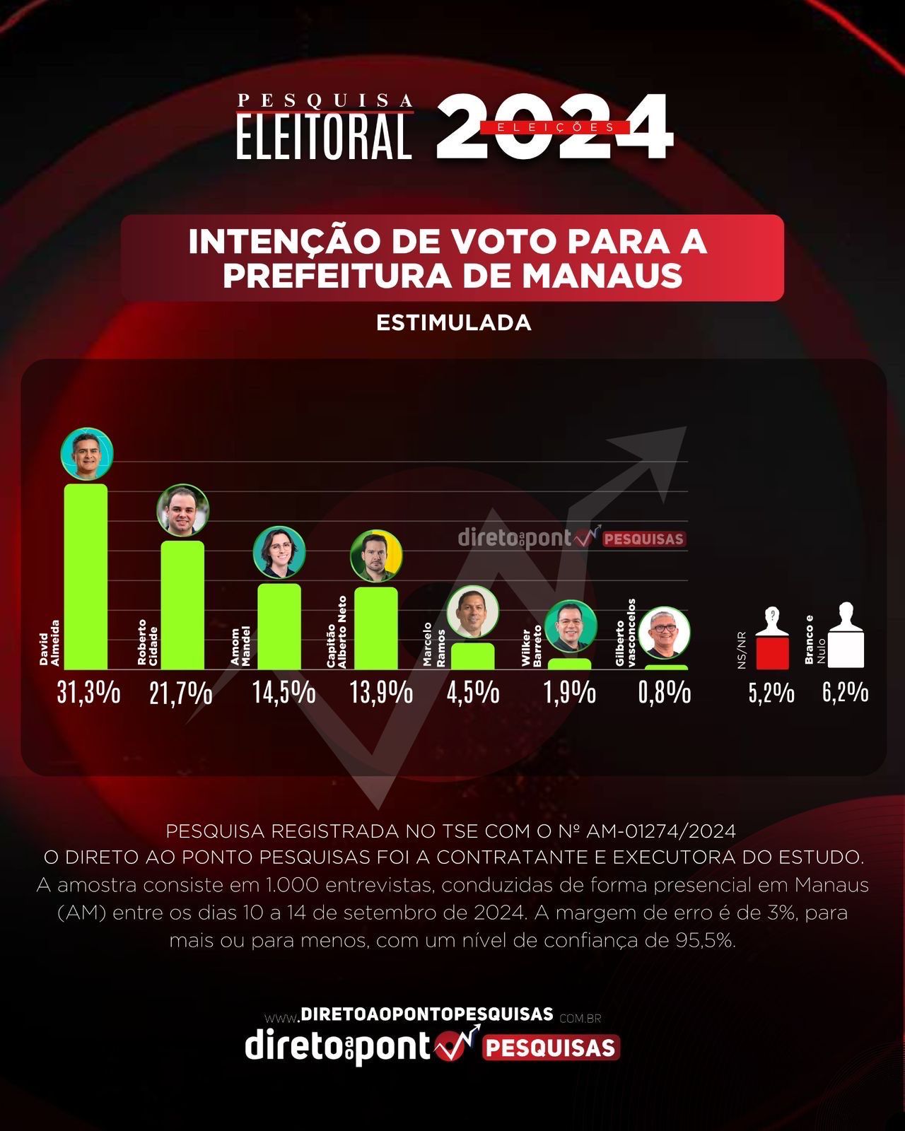 O levantamento foi registrado no Tribunal Superior Eleitoral (TSE) sob o número AM-01274/2024. A margem de erro da pesquisa é de 3 pontos percentuais, com um grau de confiança de 95,5%.