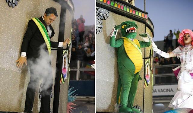 SÃO PAULO | A Rosas de Ouro transformou um personagem que representava o presidente Jair Bolsonaro (PL) em um jacaré durante desfile na madrugada deste domingo (24/4), no Anhembi, em São Paulo.