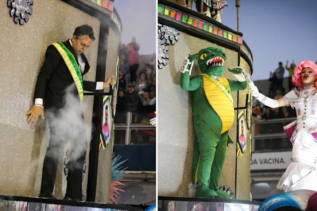 SÃO PAULO | A Rosas de Ouro transformou um personagem que representava o presidente Jair Bolsonaro (PL) em um jacaré durante desfile na madrugada deste domingo (24/4), no Anhembi, em São Paulo.