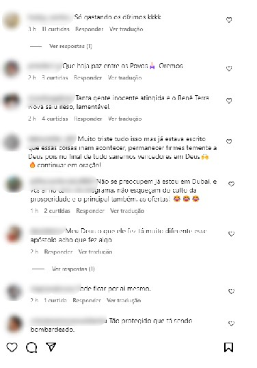 Muitos seguidores reagiram à publicação. “Não se preocupem já estou em Dubai, e vcs aí no calor da desgrama, não esqueçam do culto da prosperidade e o principal também, as ofertas!”, opinou um. “Não entendo essa doutrina da restauração”, disse outra. “Tanta gente inocente atingida e o Renê Terra Nova saiu ileso, lamentável”, disse outro.