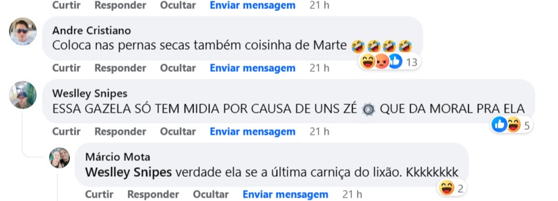 Nesta segunda-feira (7), ela disse que está vacinada, mas rebateu os homens que estão tirando onda com a magreza dela. “Coloca nas pernas secas também coisinha de Marte”, escreve um.
