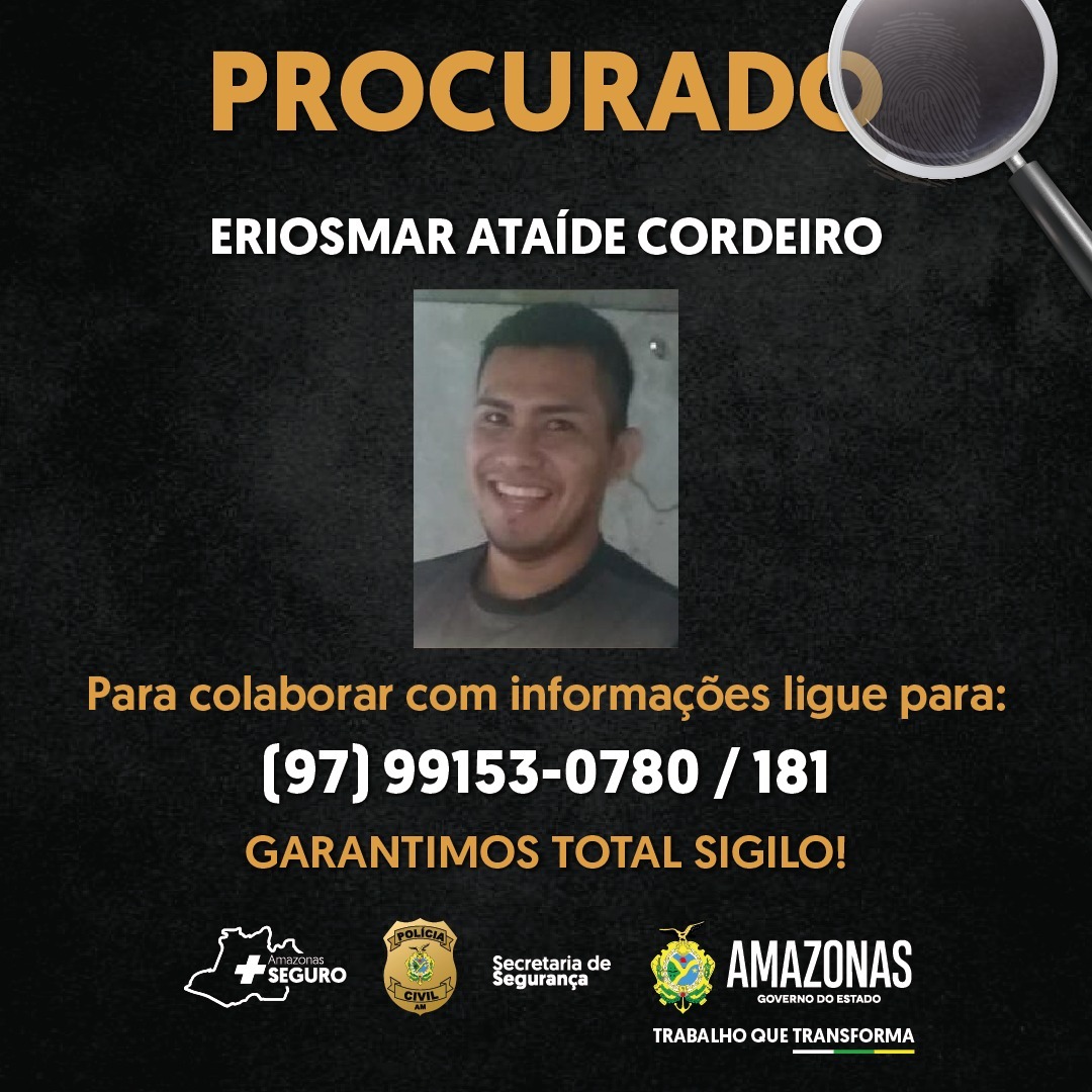 AMAZONAS– A Polícia Civil do Amazonas (PC-AM), por meio da 57ª Delegacia Interativa de Polícia (DIP) de Alvarães (a 531 quilômetros de Manaus), divulga a imagem de Eriosmar Ataíde Cordeiro, 28, que está foragido da Justiça pelos crimes de homicídio e tentativa de homicídio, ocorridos no município.