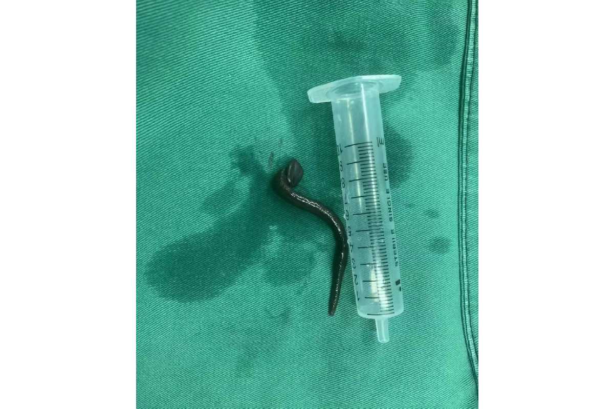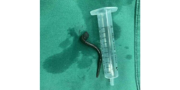 O especialista e uma equipe da unidade de saúde conseguiram remover a criatura, que na verdade se tratava de uma sanguessuga, de aproximadamente 15 cm de comprimento.