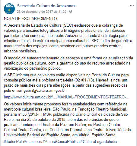 Segundo a Sec, a nova medida atende um planejamento para criação de orçamento e fomentação da cultura local, com intuito de proporcionar a manutenção do próprio teatro. Ainda de acordo com secretaria, haverá um prazo para que sugestões sejam enviadas para analise através e-mail gabin@cultura.am.gov.br