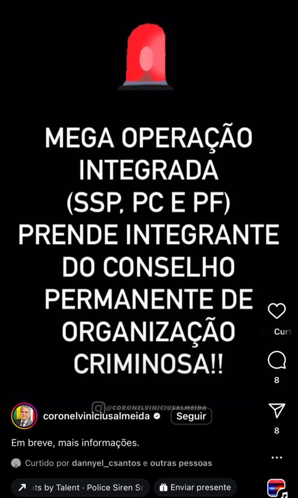 Nas redes sociais, o titular da pasta de segurança pública dá mais alguns detalhes, dizendo que a Secretaria de Inteligência (SEAI) juntamente com a Delegacia de Homicídios e Sequestros (DEHS) acabaram de prender um dos principais lideres de uma organização criminosa ligada ao estado do Rio de Janeiro.