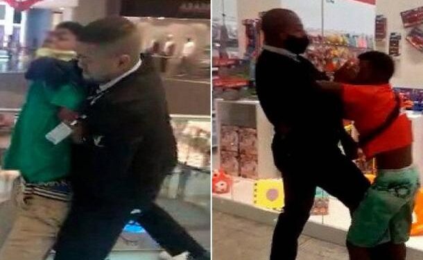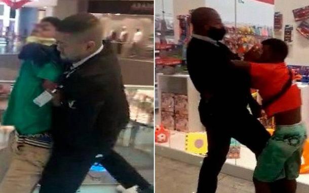 Nas imagens, um grupo de pessoas se assusta e acompanha o jovem enquanto é arrastado pelos seguranças, dentre elas uma mulher que aborda um vigilante e pede calma. “A senhora sabe o que foi que ele fez?”, questionou um dos seguranças.
