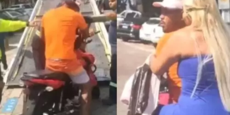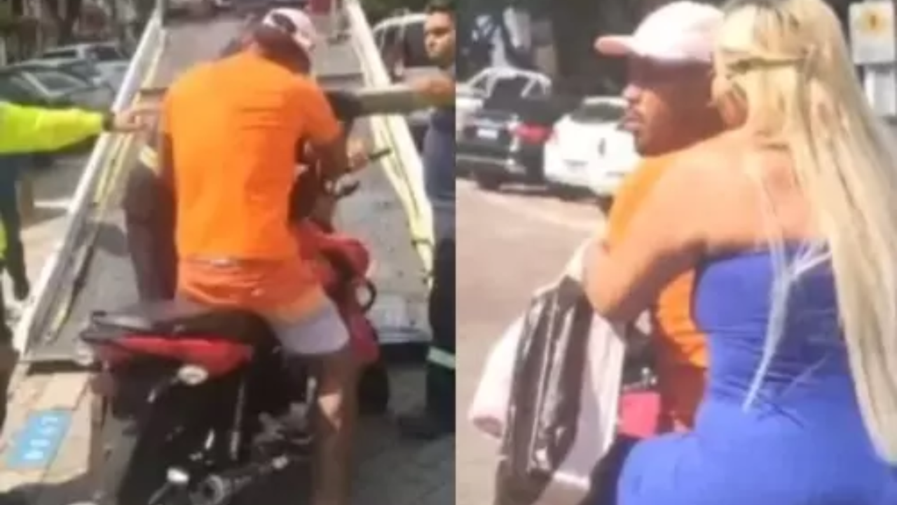 Nas imagens, ele chega no momento em que os agentes estavam colando o veículo em cima da plataforma, o homem se exalta, faz ameaças aos profissionais, sobe em cima da motocicleta e vai embora. Ele está acompanhando de uma mulher loira que carrega uma sacola de compras de uma loja popular de departamento.