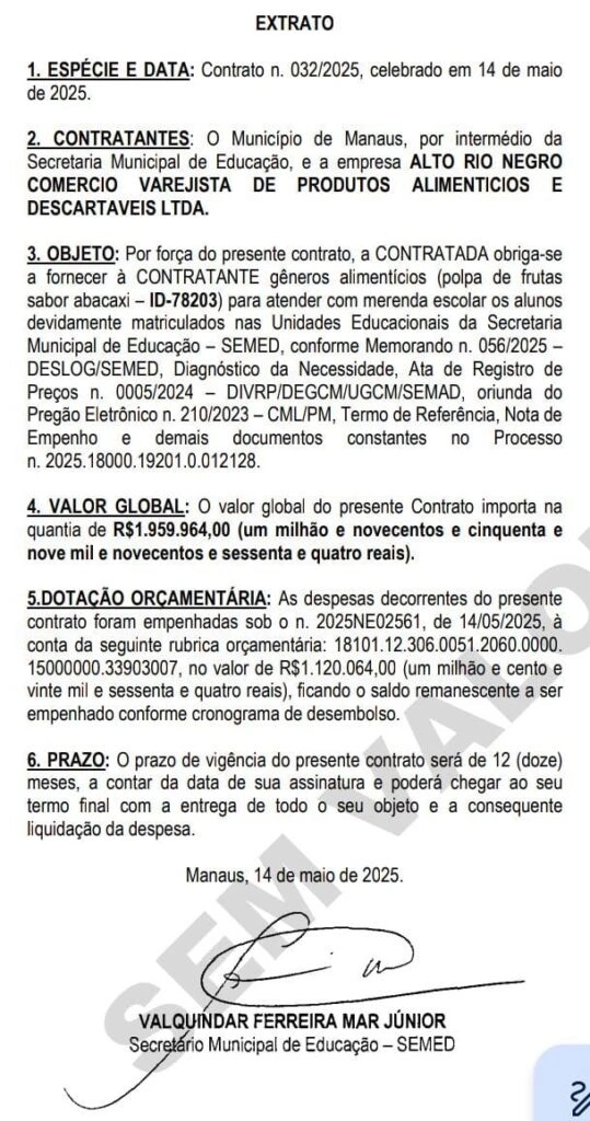 Quem vai vender tanto abacaxi para David Almeida é a empresa Alto Rio Negro Comércio Varejista de Produtos Alimentícios e Descartáveis Ltda, já com o contrato publicado no Diário Oficial do Município (DOM).