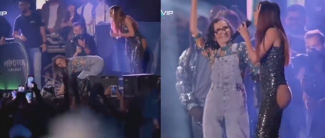 Anitta gargalhou e Marli enfiou-se no meio de Anitta e de outra dançarina e rebolou de novo, segurando no bumbum da cantora, botou a mão no joelho e fez o movimento da sanfoninha.