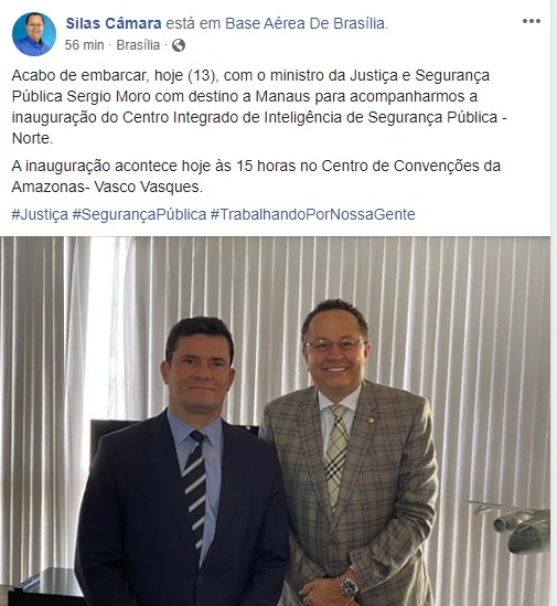 O deputado federal do Amazonas, postou uma foto com Sérgio Moro em seu facebook e relatou a visita que ambos fariam na capital amazonense.