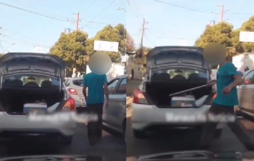 De acordo com relatos de testemunhas, um dos homens envolvidos saiu do veículo em estado de fúria, xingando o outro condutor com insultos como “Bate meu carro, bate meu carro seu filho da put*. Seu corn0”. A situação ficou ainda mais grave quando o indivíduo, claramente alterado, abriu o porta-malas e retirou o que parecia ser um pedaço de madeira, usando o objeto para ameaçar o adversário.