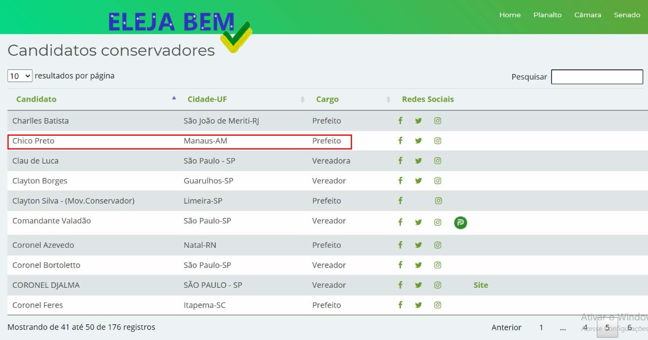 MANAUS – AM | O candidato a prefeito de Manaus Chico Preto (Democracia Cristã) foi indicado pelo site Eleja Bem (https://elejabem.com.br) como o único postulante conservador ao cargo. A página de nível nacional orienta eleitores com esse víeis ideológico as melhores opções de voto Brasil a fora. O correligionário de Chico Preto e candidato a vereador Thiago Botelho, também figura nessa lista.