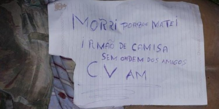 MANAUS, AM – Um soldado do Comando Vermelho (CV) ainda não identificado foi morto na madrugada deste domingo (10), em Manaus, após ser acusado de trair a facção criminosa. Um bilhete em cima do corpo explicou o motivo do crime registrado rua Pastor Eurico Nelson, conjunto João Paulo II, zona Norte.