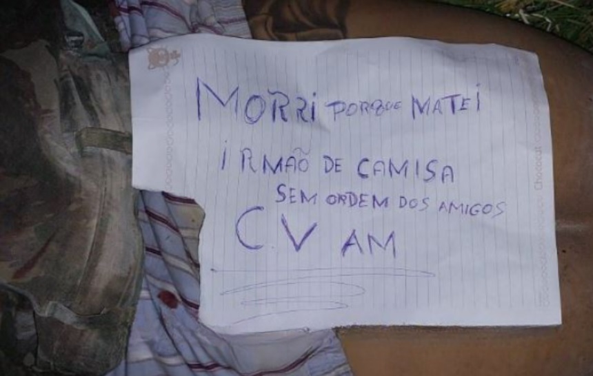 “Morri porque matei irmão de camisa sem ordem dos amigos, CV AM”, dizia mensagem deixada em cima do fiofó do morto, que perdeu a vida com ao menos 12 tiros à queima-roupa. Supostamente ele teria matado outro soldado do CV sem a permissão do comando.